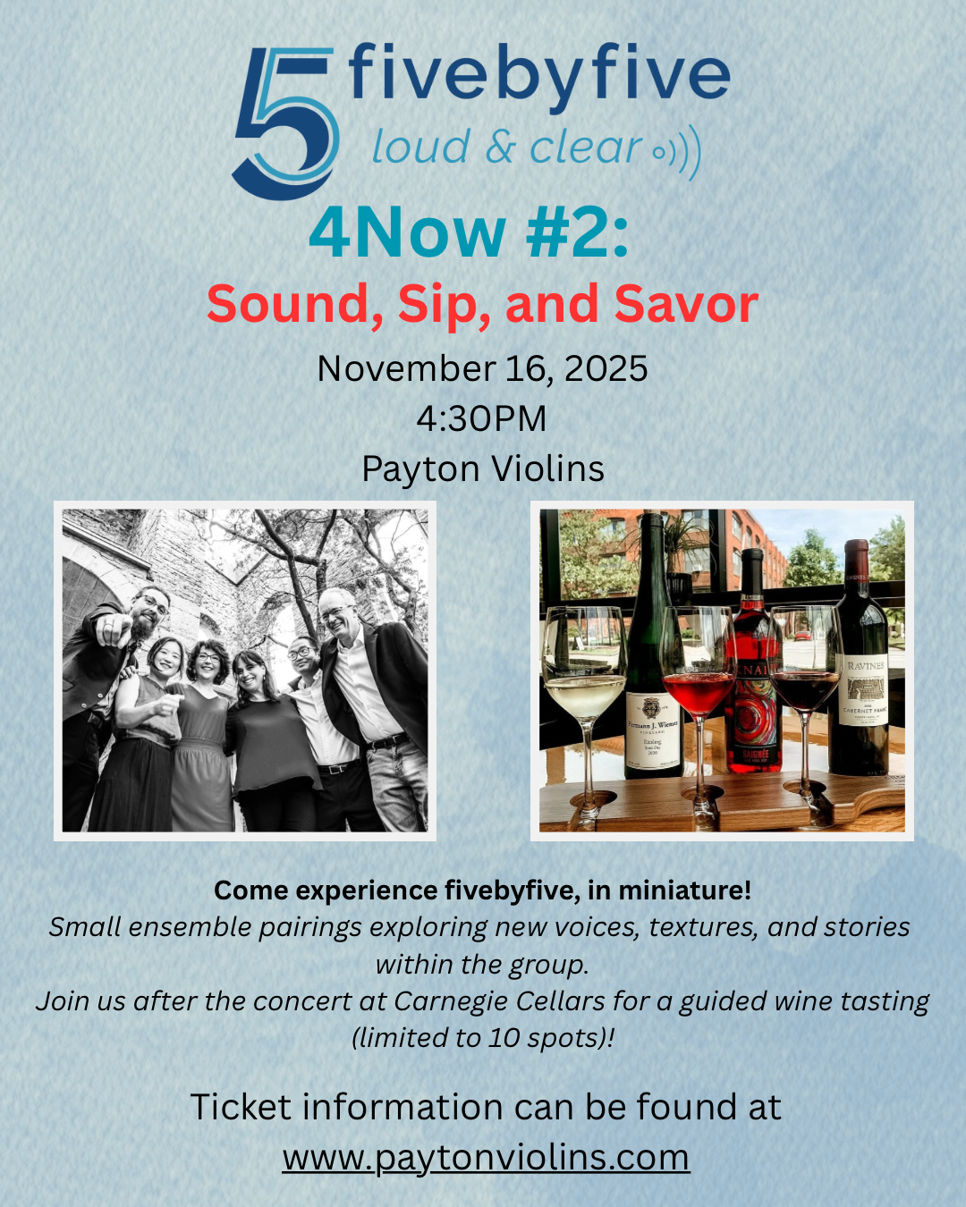 Described as “classical turned loose in the toy store,” “top-flight,” and “imaginative,” fivebyfive is an award-winning, artist-led ensemble known for its impeccable musicianship and adventurous spirit that permeates innovative, cross-genre programming and community engagement…